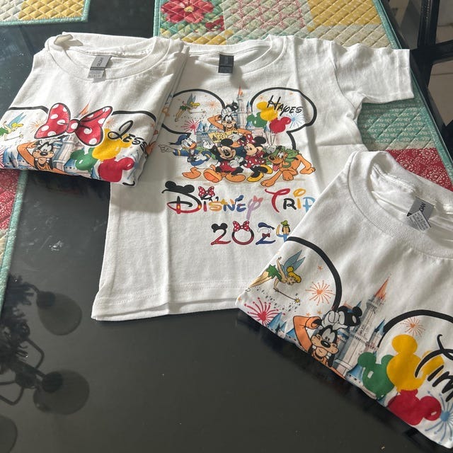 Love our family Disney shirts! Just a heads up that the print looks a lot clearer on the lighter color shirts. We ordered grey and natural and the print is a little muted on the grey. Overall, would definitely order from this shop again!